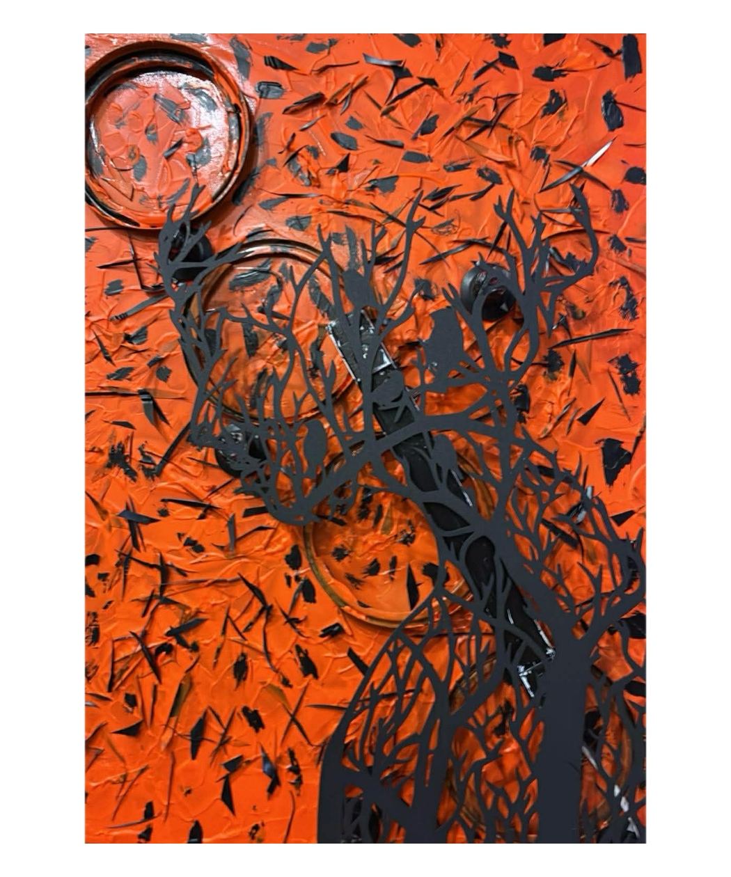Mixed media with acrylics and a metal surface in orange, with backlighting.